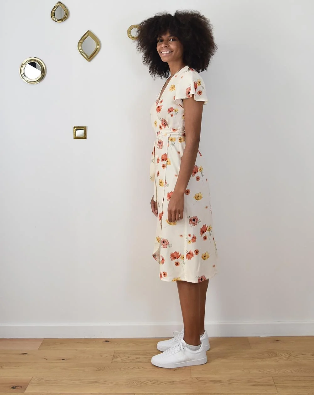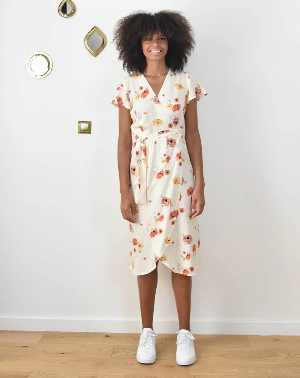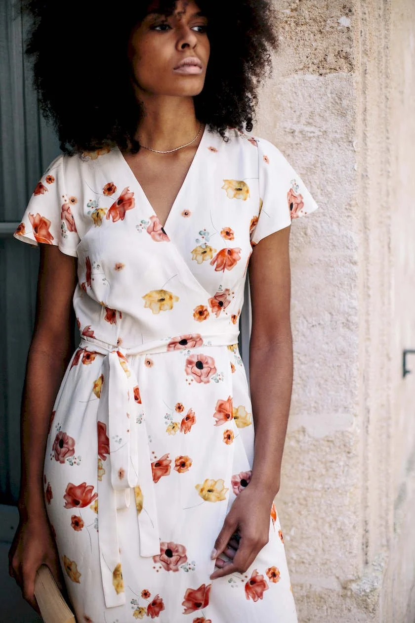 Robe portefeuille longue, fermeture ceinture et manches courtes