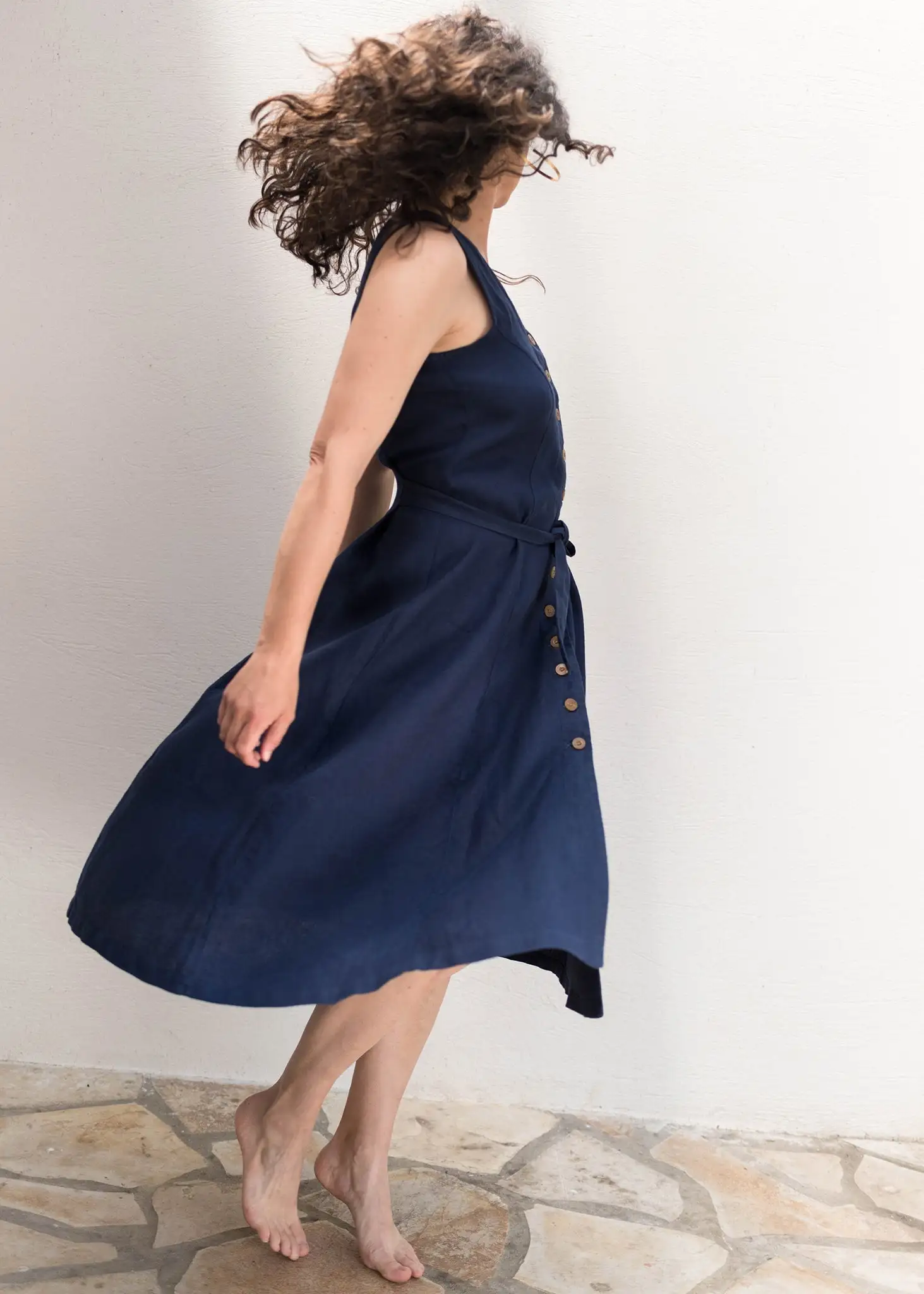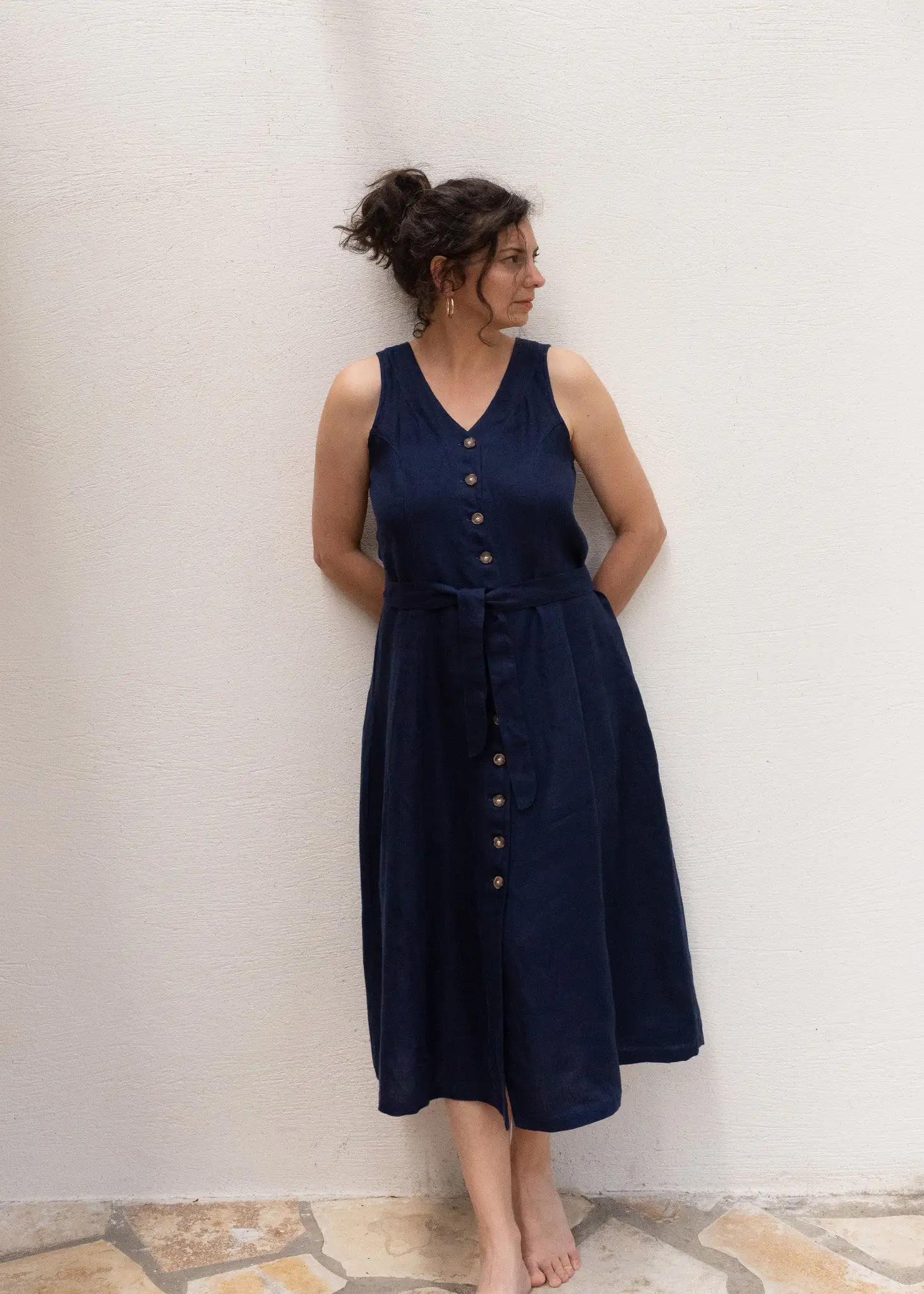 Le lin a été cultivé entre Caen et Amsterdam puis transformé en fil, teinté et tissé en Lituanie. Enfin, la confection a été réalisée en Pologne. Le fil à coudre et les étiquettessont en coton biologique.