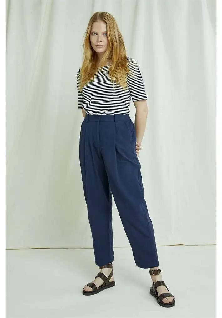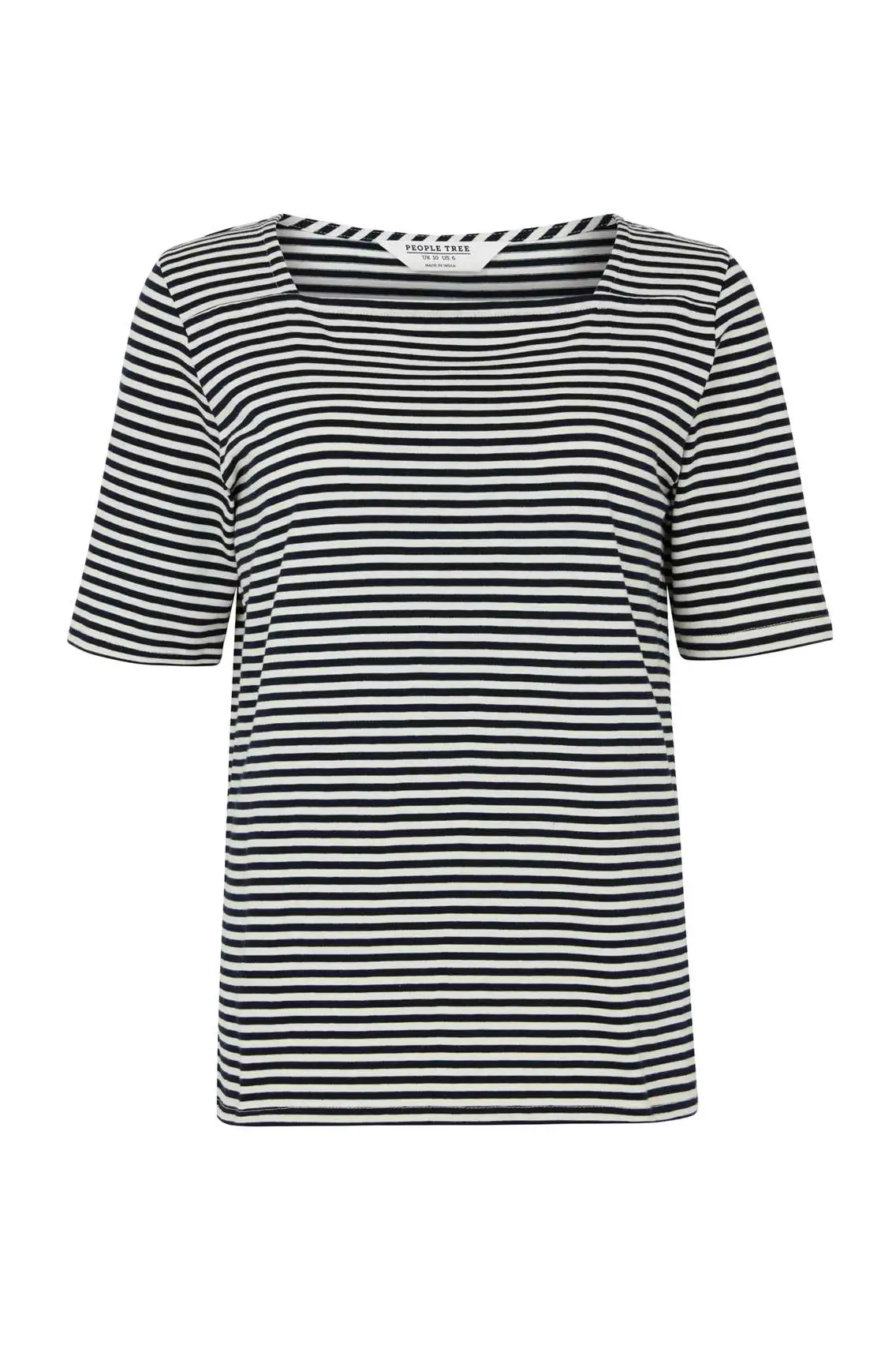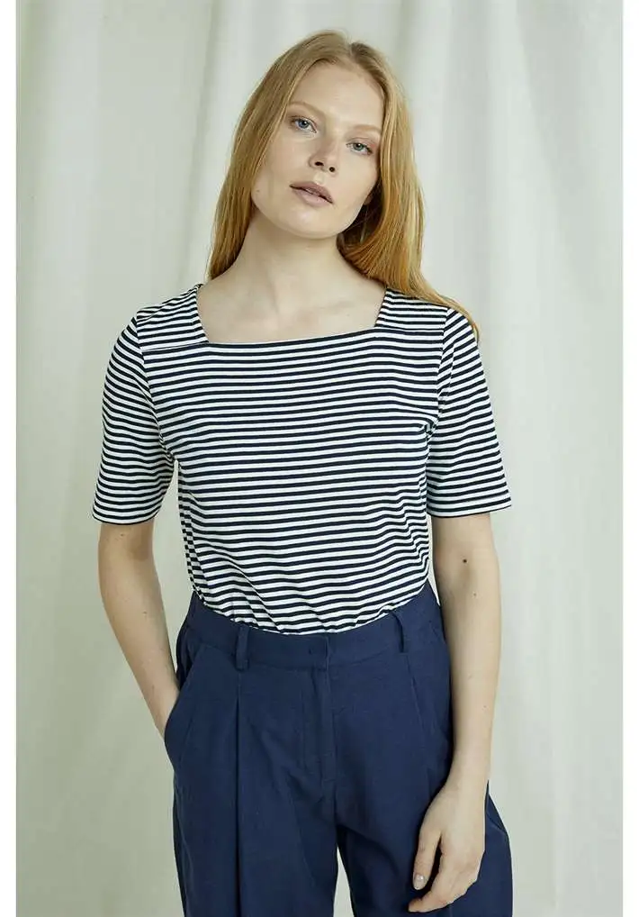 Top rayé bleu marine à col carré ; Manches au niveau des coudes