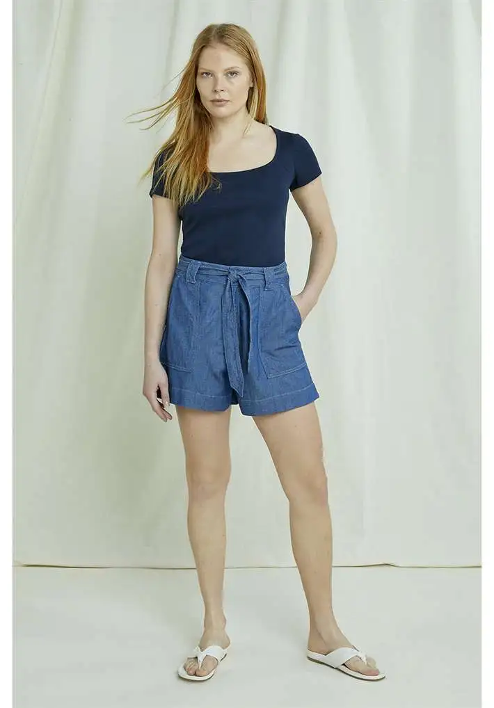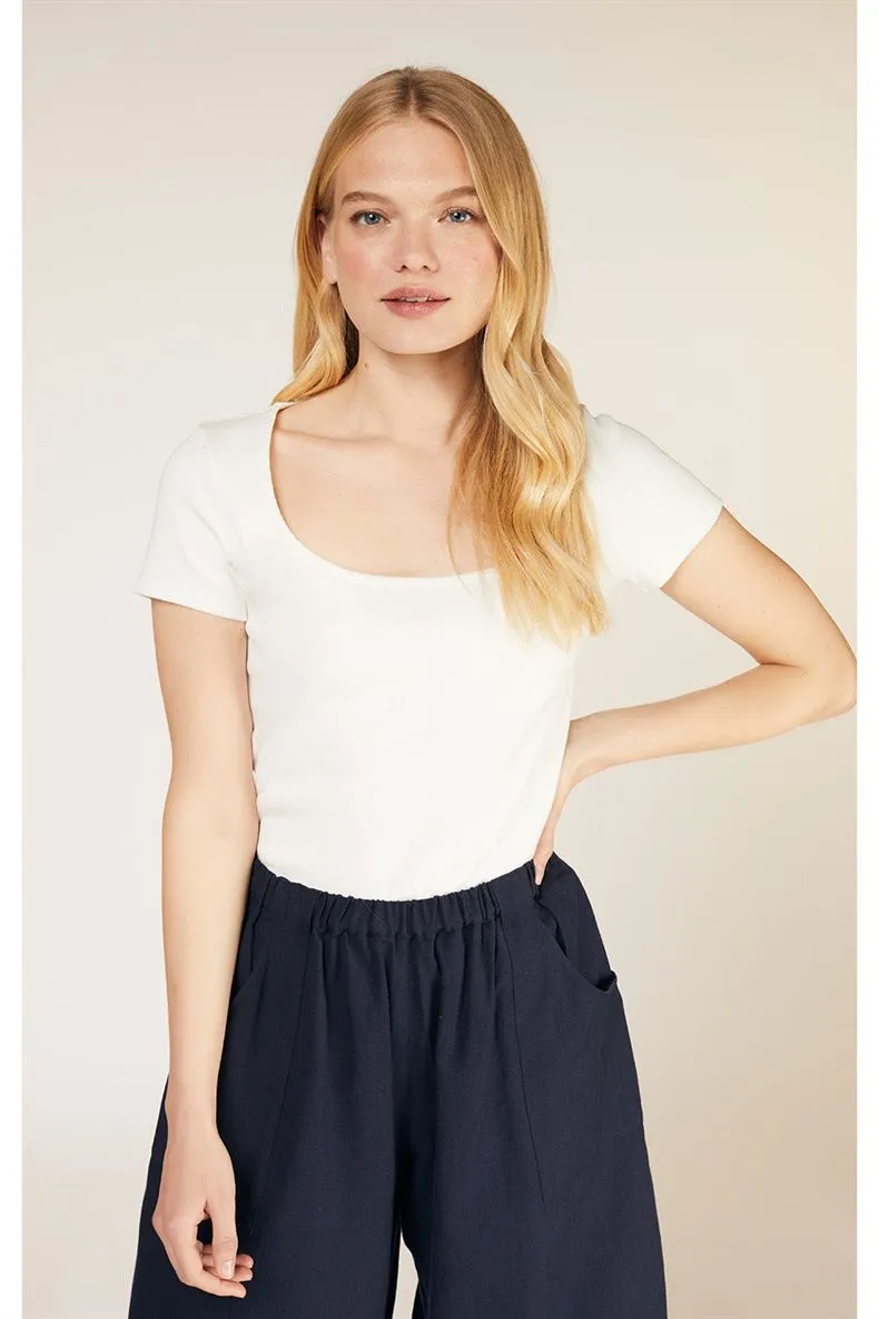 Modèle à encolure carrée et manches courts.